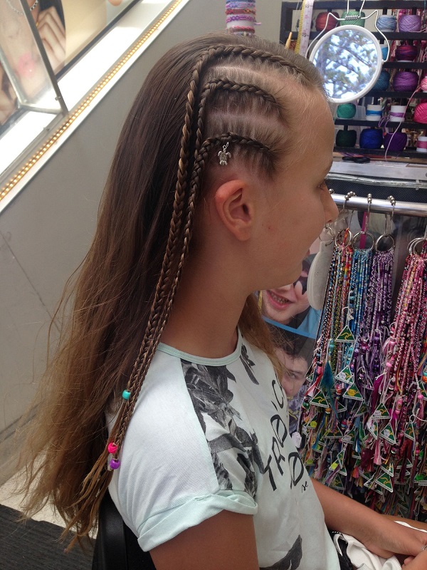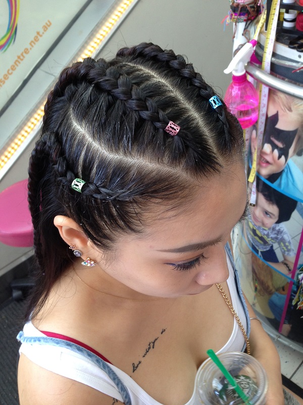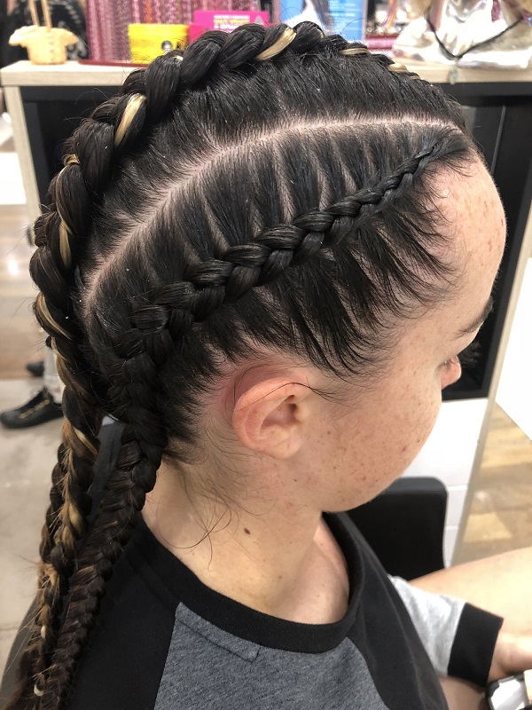 Cornrows are the trending style right now. You can get as many or as few as you want. The front part is famous for keeping hair out of one’s face. In addition, three cornrows on one side of the head are THE fashion statement of the day! We give you written care instructions to take home so you can maintain your new hairdo and get the most wear out of it. We also add the product to the braids to make them last longer and keep them from becoming frizzy. Please select from a wide range of styles in our on-site inventory.
